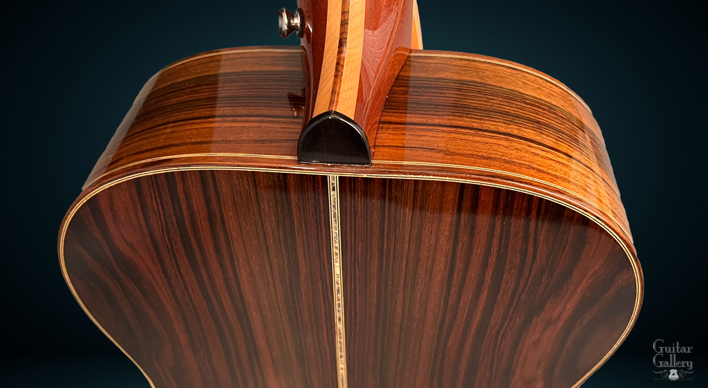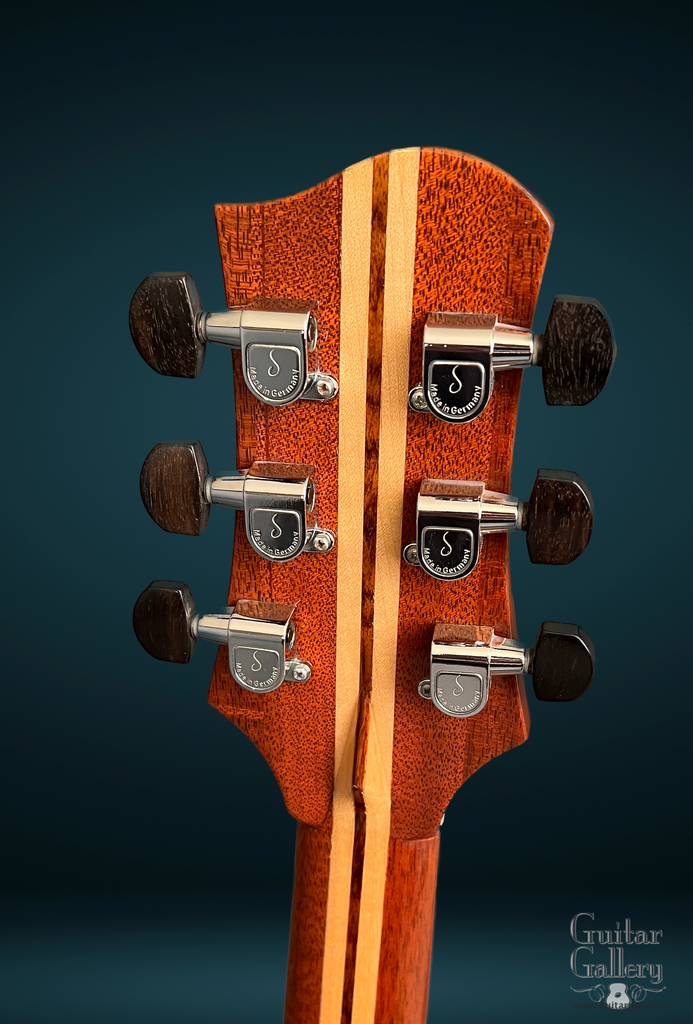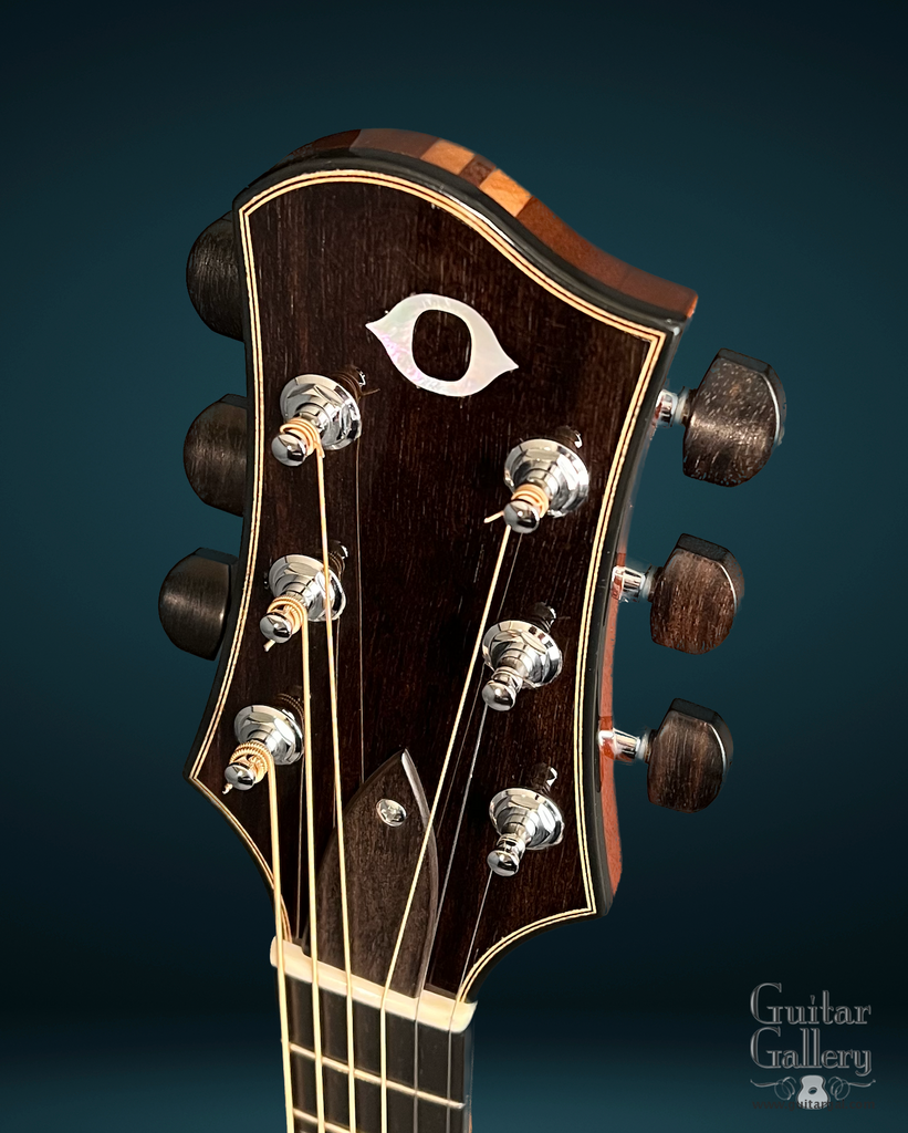 - Ebony headstock faceplate with Mother-of-Pearl builder logo