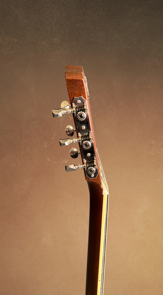 - Slotted headstock with National metal logo and Ivoroid truss rod cover