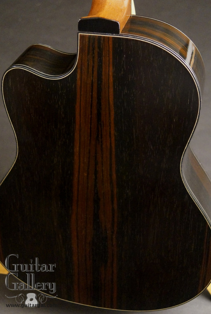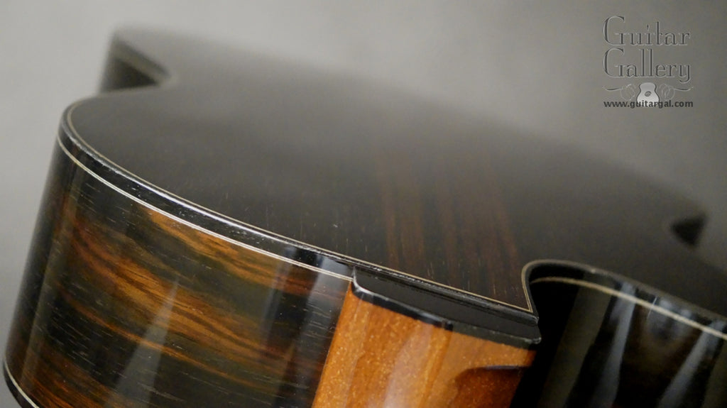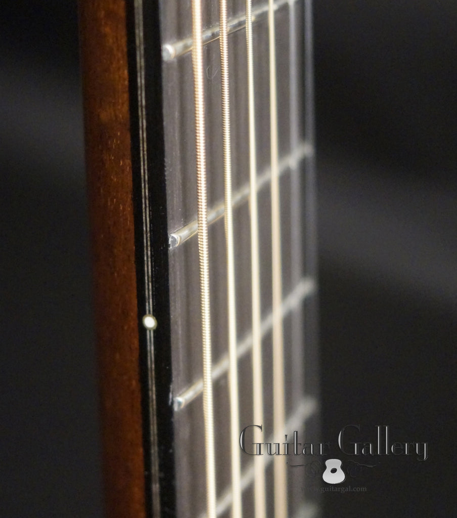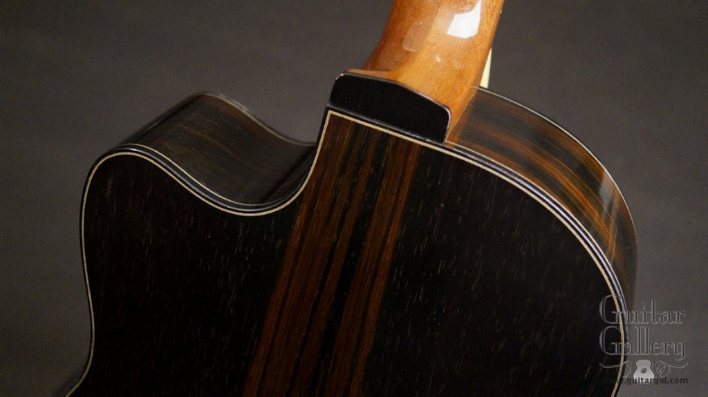 Ebony fretboard that is bound with Ebony and sports purfling lines. Side dots outlined in brass. Ebony body bindings and Laskin style ergonomic arm BEVEL.