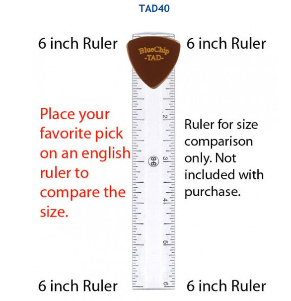 The TAD40 pick in 40/1000 of an inch(1.0mm) thickness. It is shaped identically to the TP, but is slightly larger. All BlueChip Picks are professionally machined, laser engraved, and hand beveled.