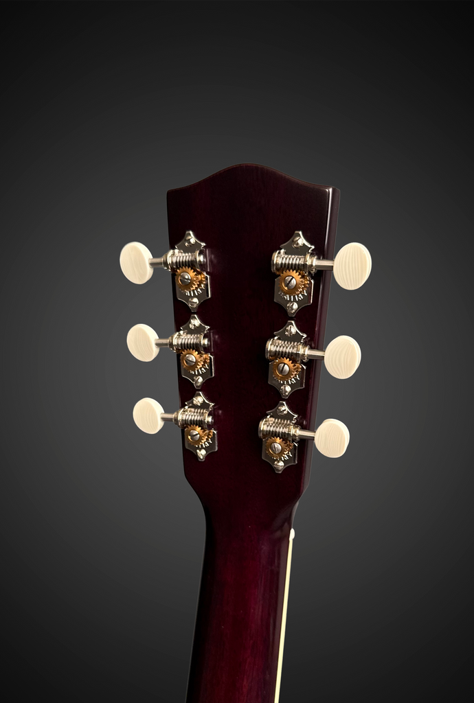 - Ebony headstock faceplate with MOP builder logo